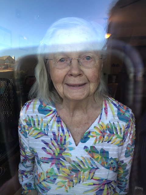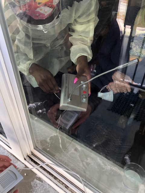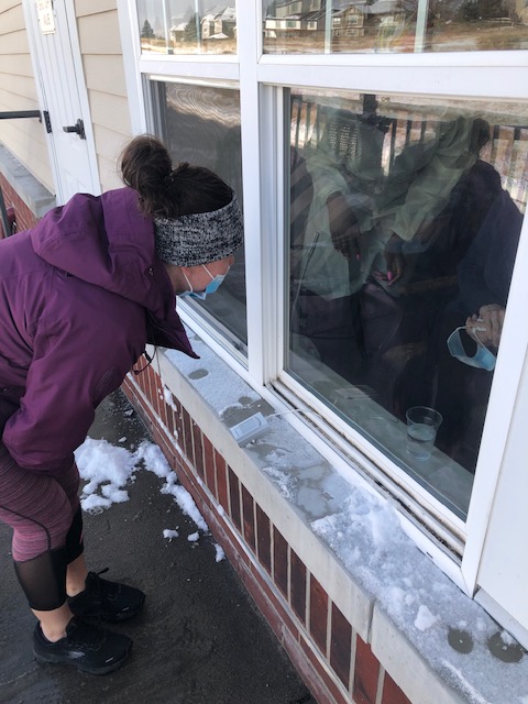 In March 2021, we were allowed “window visits,” where Mom was inside and her visitors would sit outside. There was a microphone wire placed through the window so we could talk.