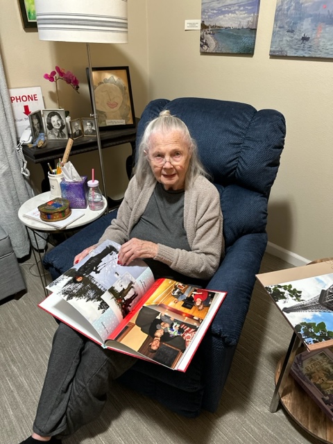 She’s not interested in reminiscing or looking through old photo albums anymore. She does enjoy a few Shutterfly albums with large color photos and labels she can read aloud.  Mom loves to read aloud. She also enjoys watching cartoons with closed captions (which she reads aloud), and coloring, or painting.  I try to do one of these activities when I visit.