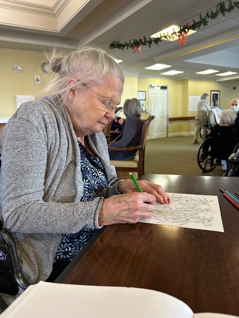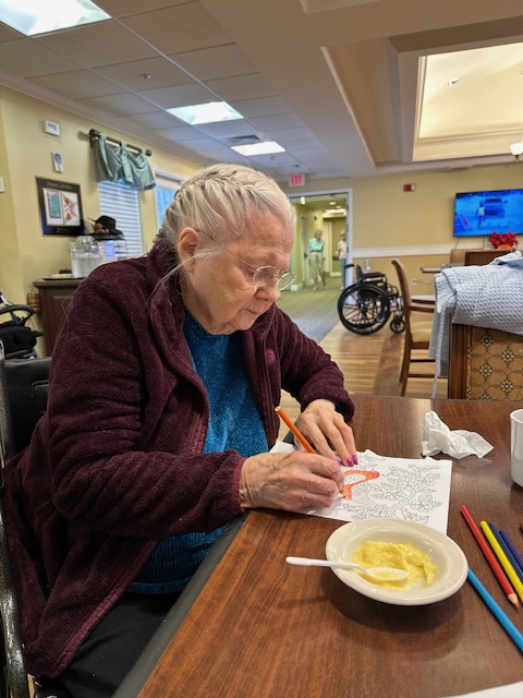 Whenever I visit, I find this situation disturbing, so I offer coloring sheets and markers or a magazine to the people sitting stoically at their tables. Most decline sweetly. The facility used to have a Social Director who occasionally organized Bingo and other activities, but I haven’t seen many entertainment opportunities in recent years. When I visit with my mom she is always happy to see me and prefers to remain in the dining room. She enjoys my company, but has difficulty carrying on a conversation, so for most of the visit we sit quietly together and color.